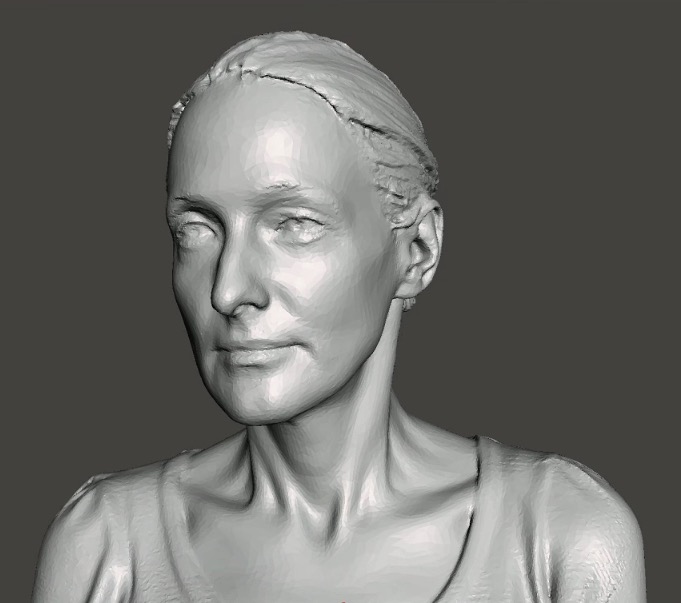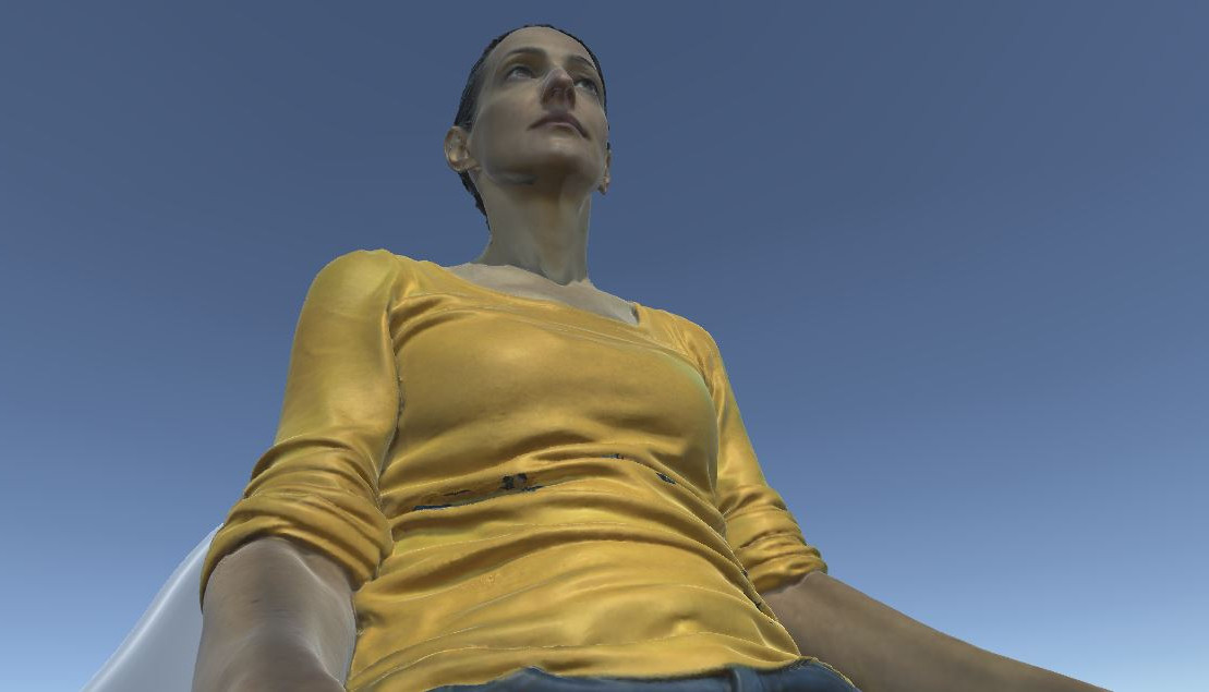 3D-Scan von menschlicher Figur sitzend mit Stuhl. Das Objekt ist im virtuellen Raum erfahrbar. Es entspricht einer Gesamthöhe von 180 Metern. Das 3D-Objekt wird zum Planeten, die der Benutzer erkunden kann.